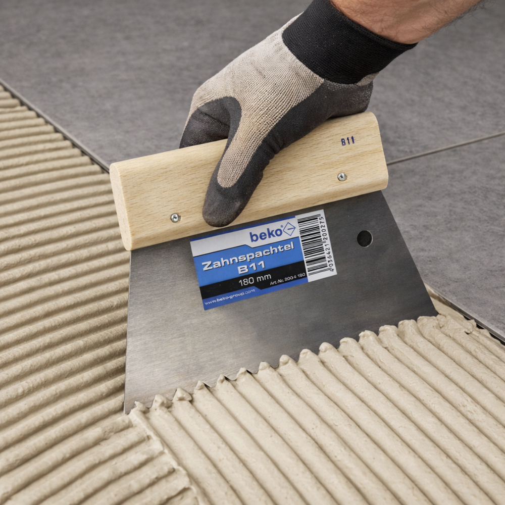 Bei der Verarbeitung von Klebstoffen entscheidet die richtige Zahnung über die spätere Haftung des Belags. Mit einer B11-Zahnung wird eine definierte Klebermenge aufgebracht, die eine sichere Verbindung zwischen Untergrund und Belag unterstützt. Gerade bei Bodenbelägen oder großformatigen Fliesen ist eine gleichmäßige Rillung entscheidend für das Ergebnis.